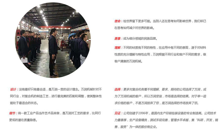 溫州萬(wàn)潤(rùn)機(jī)械有限公司(原瑞安市意聯(lián)機(jī)械有限公司)位于浙江省最前沿的東海之濱瑞安市。距機(jī)場(chǎng),火車(chē)站30多公里,緊靠104國(guó)道,交通便利。公司創(chuàng)建于1996年,是國(guó)內(nèi)生產(chǎn)印刷包裝設(shè)備的專(zhuān)業(yè)制造商。